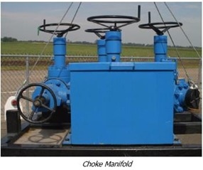 The Choke Manifold controls fluid flow from the well by reducing the flowing pressure. The pressure drop across the choke helps to achieve critical flow.