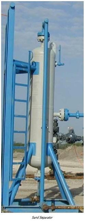The SAND TRAP (SEPARATOR) is used to remove produced solids from the well effluents. In a production test equipment configuration, the sand separator is usually located downstream the choke manifold. The well effluent exits the choke manifold after a pressure drop across the choke and enters the sand separator. Following the inlet to the sand trap, the flow diverter causes the well effluent to flow tangent to the wall of the trap. The fluid spins about the wall of the sand trap, creating a centrifugal force. The centrifugal force causes the solids to separate from the well effluents because of the difference in their densities. Gravitational force causes solids to drop to the bottom of the sand trap. Accumulated solids are removed from the bottom outlet at desired intervals.